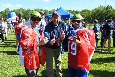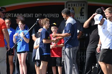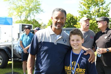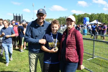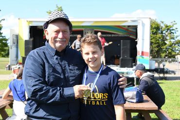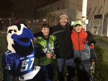 After the NS Peewee Football Championship in Halifax . Fischers team won 16 - 14 , and Fischer got all their points . This is RJ as the Mascot ( The Hawk ), Fischer with his MVP trophy , proud grandfather and fan Tyler !!